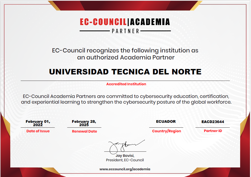 La Universidad Técnica del Norte (UTN), como parte de las actividades de enseñanza, investigación y conexión con la comunidad, ha creído conveniente a través de la Facultad de Ingeniería en Ciencias Aplicadas (FICA) la asociación al EC-COUNCIL, con el propósito de mejorar el conocimiento de estudiantes y profesores en las áreas de Comercio Electrónico y Seguridad Cibernética, elevar la calidad de la enseñanza-aprendizaje en los campos mencionados.