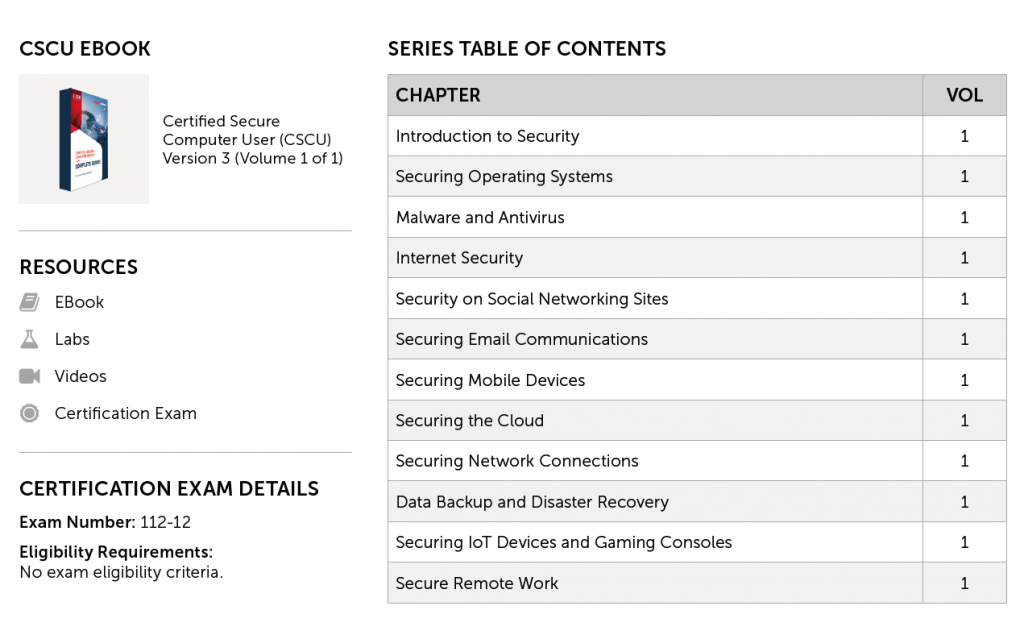 El propósito del programa de capacitación de Usuario de Computadora Segura Certificado (CSCU) es brindar a las personas los conocimientos y las habilidades necesarios para proteger sus activos de información. Esta clase sumergirá a los estudiantes en un entorno interactivo donde adquirirán una comprensión fundamental de diversas amenazas a la seguridad informática y de red, como el robo de identidad, el fraude con tarjetas de crédito, las estafas de phishing en la banca en línea, virus y puertas traseras, correos electrónicos fraudulentos, delincuentes sexuales que acechan en línea, la pérdida de información confidencial, los ataques de piratería informática y la ingeniería social. Más importante aún, las habilidades aprendidas en la clase ayudan a los estudiantes a tomar las medidas necesarias para mitigar su exposición a la seguridad.