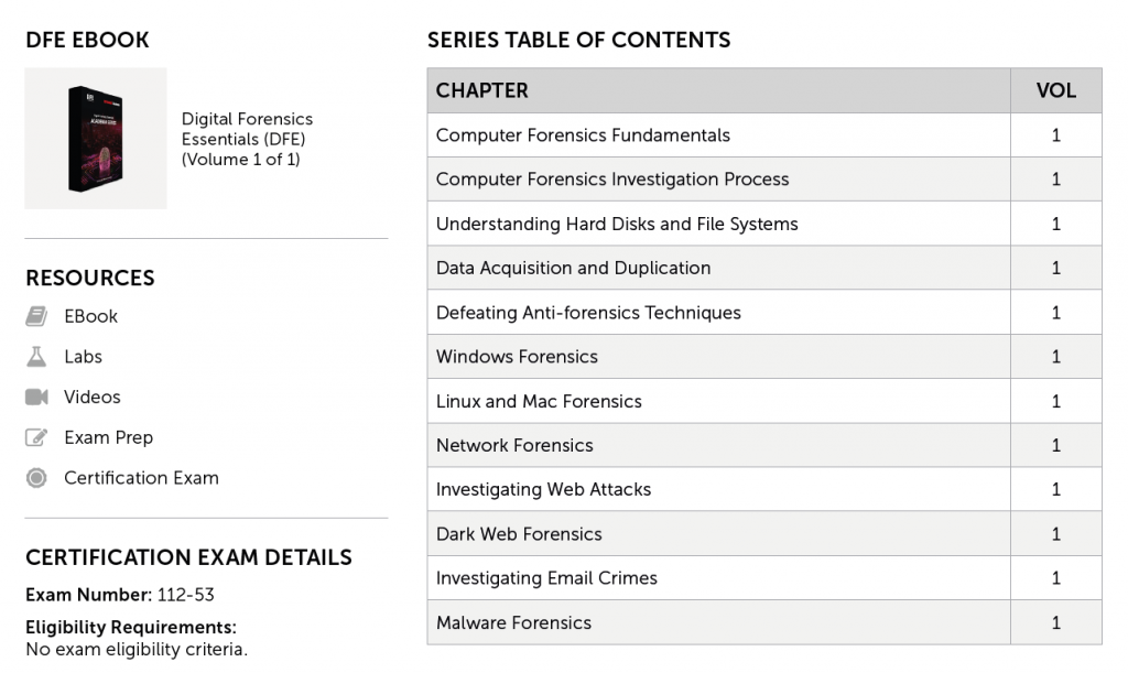 Fundamentos de Informática Forense (DFE) es un programa de ciberseguridad de nivel básico, diseñado para ayudar a los estudiantes a mejorar sus competencias y experiencia en informática forense y seguridad de la información, aportando así valor a su lugar de trabajo y a su empleador. Este curso les presentará los fundamentos de la informática forense y el proceso de investigación forense. Aprenderán sobre la Dark Web, Windows, Linux, análisis forense de malware y mucho más. Los laboratorios interactivos de este curso garantizan que los estudiantes adquieran la experiencia práctica necesaria para tener éxito en la informática forense.